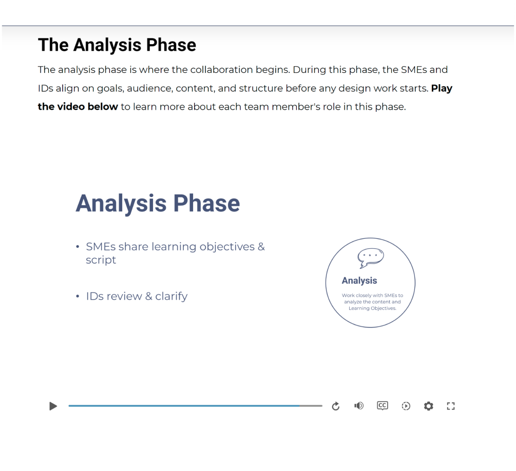 Using Articulate Rise 360, I created an overview of the process our ID team follows during collaboration—from identifying goals and collecting content to implementing and evaluating the final learning experience. The learners’ understanding deepens through short videos and interactive activities regarding each step of the process. The learning experience outlines the roles of each team member, including the instructional designers, to clarify responsibilities throughout the collaboration process. Key forms used during the project are presented as interactive graphics, helping SMEs better understand the type of information they will be asked to provide. The module also allows users to experience the course in a format similar to what their own learners encounter, giving them insight into the structure and flow of a finished learning product.